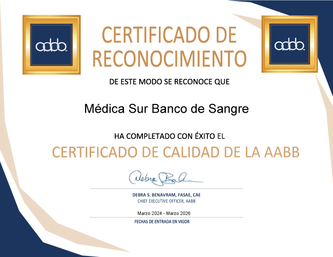 El Banco de sangre de Médica Sur es el primero en Latinoamérica en alcanzar este certificado de calidad con el que se promueven los más altos niveles de calidad y seguridad para pacientes y donantes. Tiene una vigencia de dos años, es decir, su vigencia es de marzo 2024 a marzo 2026.